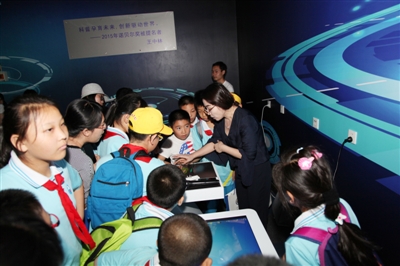 在中国科学院北京纳米能源与系统研究所里,有一间百平米左右的MaxWell创新科普实验园,主持创新科普园的是一位双聘教授和博士生导师。该科普实验园专注于将最新的纳米发电技术用最通俗易懂的方式向大众科普。开园以来,已吸引了来自世界各地不同年龄段的体验和参观者。图为园长曹霞向参观者介绍摩擦纳米发电机的原理。