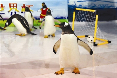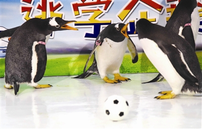 6月14日,极地企鹅在“世界杯”比赛中。在世界杯即将开赛之际,黑龙江哈尔滨极地馆的6只极地企鹅分成两队,上演了一场萌味十足的“世界杯”比赛。在现场,企鹅球员们分成红、蓝两队。随着裁判员的一声哨响,一场五花八门、史无前例的“逃学企鹅”世界杯正式开赛。当定制足球出现在球场中间时,“球员”有的远远观望,有的上前试探,戏精范儿十足的几位还选择了用嘴啄、用翅膀扇,有的“球员”竟然完全无视比赛,跑到球门边上“忘我”地玩儿起了球网,真是花样百出。当“世界杯”遇上了“端午节”,“粽子”就成为了当仁不让的奖品!这场比赛虽然以0:0告终,但是,所有上场“球员”均获得了定制奖品——冰皮粽子一枚。据了解,这款“粽子”由驯养师精心研制,用料十足,薄薄的冰皮包裹着小鱼和磷虾,让“球员”们大饱口福。