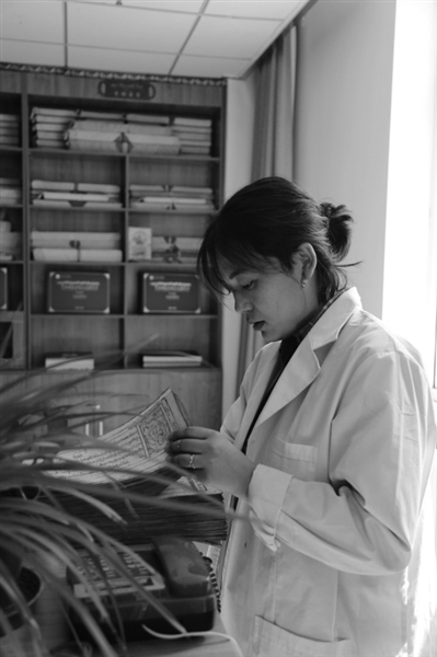 图为青海省藏医药研究院工作人员德吉卓玛正在修复藏医药古籍《四部医典》。