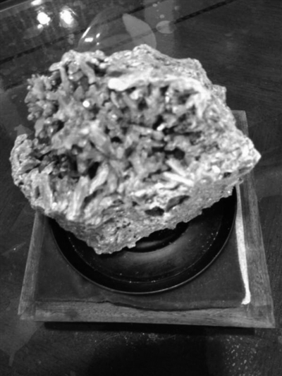 “彩色元宝”这件雄黄矿石,石体黑褐色伟晶岩,形似元宝。宝腔遍布紫红色柱状雄黄结晶体。其间共生有众多石英、方解石和雌黄、辰砂,黑、白、红纷呈,锥状、柱状、块状混杂,交相辉映,光彩多目。“黄台金花”这件雌黄矿石,石体黑色包裹有灰色石块,表面遍布黄色粉末。台上长着众多棱柱状的赤黄色雌黄结晶体,棱面有金色光亮。