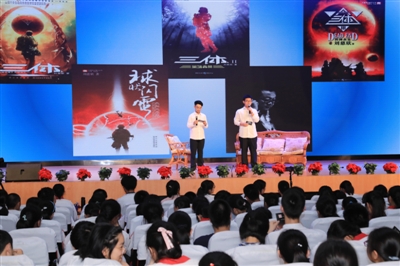 为了更好地推动学校的科学阅读,我们以高一学生为主,成立了“科幻读书社”。今年4月13日举行成立大会,科幻社同学设计了自己的社团LOGO,通过了章程,选出了负责人,制定了社团活动方案,开展丰富多样的科幻阅读活动,而其中最有影响的活动,是与经典夜读小组合作在学校新青年剧场举办的夏季夜读沙龙:“黑暗森林之歌——刘慈欣《三体》的N种读法”。他们借鉴了媒体谈话类节目的形式,选择《三体》这部科幻名著,采用精心布置的舞台化场景,以嘉宾对话、角色朗读、歌曲演唱、舞台表演、主题辩论、影像图文插播等手段,把书中的核心内容、思想主题、观念原理、人物形象、关键细节、表达特色等展现在广大师生面前。