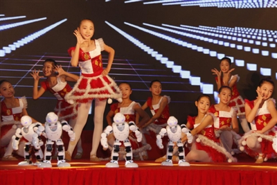 | 2017年,深圳市宝安区滨海小学第十届缤纷科幻节中,孩子们与机器人共舞《你好,未来》。 |