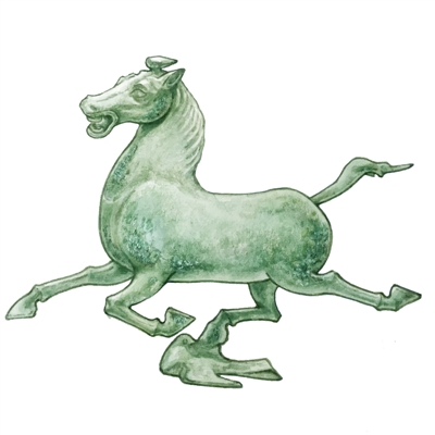 铜奔马的体型的确有别于蒙古马,分明是一匹来自西域的神马,躯体壮实,四肢修长,矫健俊美,别有风姿。骏马昂首嘶鸣,腾空飞驰,蹄踏飞燕。尤其是蹄踏飞燕的巧妙构思,不仅让铜奔马雕像稳居台基,还显现出神马的迅疾,活灵活现地呈现在我们面前。其轻盈飞姿,还使小鸟回首而望,错愕与奔马的不期而遇。