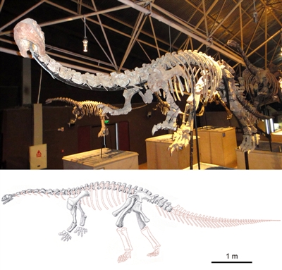 | 孙氏彝州龙骨骼装架照片及素描复原图。 (素描复原图为古脊椎所郭肖聪绘制) |