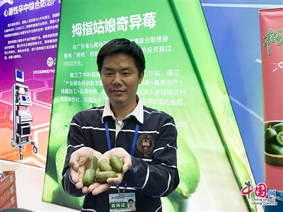 “直接入口、比大果还甜……”在2018年全国大众创业万众创新活动周北京会场上,“拇指姑娘奇异莓”创始人沈镇一边招呼大家品尝,一边介绍:外形很矫小、光滑无毛、维生素C含量却更丰富,这是一种叫做奇异莓的水果,学名为软枣猕猴桃。
