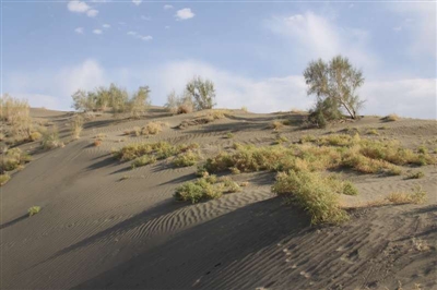 车开进保护区,我感觉置身一片沙海,道路两边老胡杨盘根错节、枝桠纵横,显露沙漠英雄本色;新生胡杨枝繁叶茂、郁郁葱葱,给戈壁荒漠带来无限生机,胡杨被人们赞誉为“沙漠英雄树”,夸赞胡杨巨大的生命力是“三个一千年”,即活着一千年不死,死后一千年不倒,倒后一千年不烂。