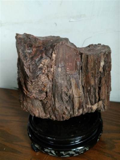 我收藏的这件硅化木藏品,为玩石界划归的特异石。因为它同陨石、火山蛋、闪电熔岩、月岩等,有的来自宇宙空间其他星球的石头,有的来自某种自然现象形成的奇石。有特异的本体,或具有某种特异品质。这件藏品,高16厘米,周围50厘米。观赏特征:完全石质化。外面处可清晰见竖向纤维肌理,石体中腰有断裂缝。其突出的一块,可明显看出原是树瘤。硅化木呈土褐色,石体坚实,手感沉重。形似坐蹲,取名石蹲。