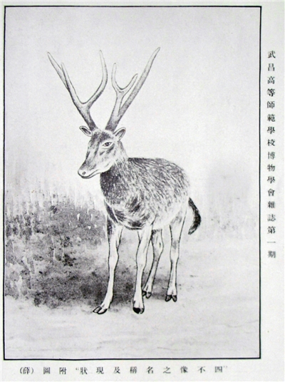 1865年,法国传教士大卫(Armand David)从北京南苑获取到麋鹿标本。次年,法国巴黎自然历史博物馆的爱德华兹(Milne-Edwards)确定其为新属新种,由此开启了对麋鹿的科学研究。但中国学者对麋鹿的研究起于何时呢?这就要追溯到100年前的1918年了。这年6月出版的《博物学会杂志》创刊号上,刊登了由薛德焴先生撰写的名为《四不像之名称及现状》的论文,全篇共约3600字,并有插图和附图各一张。