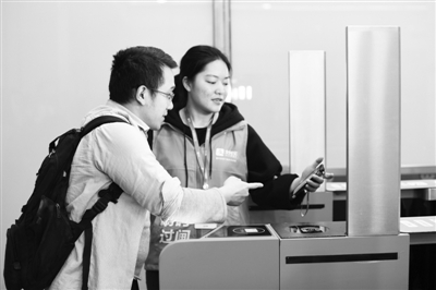 1月20日,在广州东站,一名旅客在工作人员指导下体验支付宝扫码乘车。