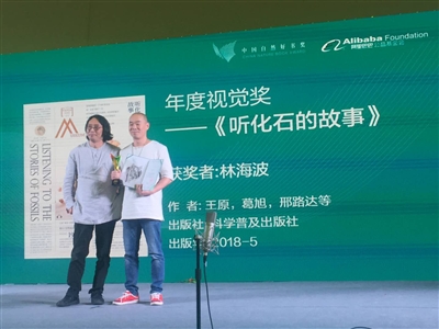 | 首届“中国自然好书奖”的视觉设计奖,授予了《走进中国科学院博物馆:听化石的故事》一书的设计师林海波。本奖评委、著名图书装帧设计师朱嬴春评价说,“他设计的书更像一本书”。应本报之约,林海波撰文畅谈自己设计科普图书的心得体会,与读者分享。 首届“中国自然好书奖”颁奖现场,朱赢椿为林海波(右)颁发年度视觉奖。 |