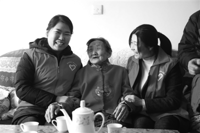图为青年志愿者在97岁老党员赵玉芝家中陪老人唠嗑,聆听革命故事、油田创业故事,共叙油田翻天覆地的变化。谈到当下的美好生活,赵玉芝老人的幸福笑容挂在脸上。