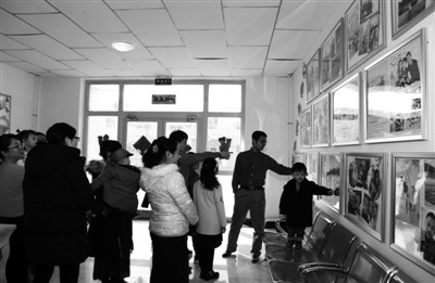 图为在开发研究所办公楼门厅,“反探亲”家属看着自己的“全家福”照片笑容满面。张明江 朱春江 摄