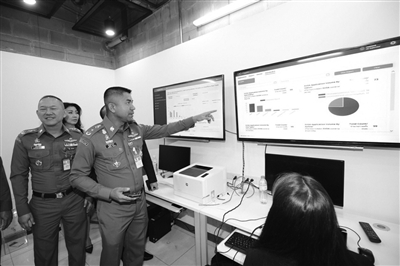 2月15日,泰国移民局局长素拉切(中)在曼谷素万那普机场了解新版电子落地签证使用者数据。