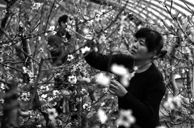 随着气温升高,河北省邯郸市邯山区硕果春农业园大棚内的桃花竞相绽放。2月25日,果农在邯郸市邯山区硕果春农业园大棚内为桃花授粉。