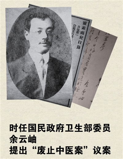 1929年2月,国民政府召开了“中央第一次卫生委员会议”,时任中华民国医药学会上海分会会长的余云岫等提出了“废止旧医以扫除医事卫生之障碍”的提案,其中提到“旧医一日不除,民众思想一日不变,新医事业一日不能向上,卫生行政一日不能进展”等。提案被以行政院长汪精卫为代表的国民政府通过,并作出“取缔中医”的决议。