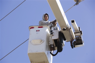 | 王舒平借助绝缘斗臂车带电处理电网 |