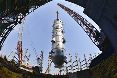 当日安装就位的这两台SE-东方炉,设备净重310吨,高24米。由炼化工程集团起重运输公司执行吊装作业。