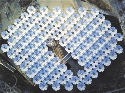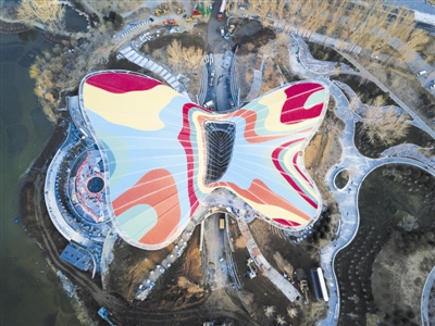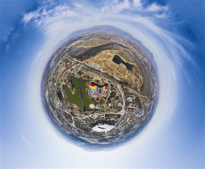 | 无人机拍摄的北京世园会园区“小行星”效果图,位于画面中心的建筑是妫汭剧场(电脑合成) |