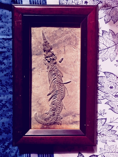 这是一件来自贵州盘县的鱼龙化石。它长41厘米,肋骨长6厘米。头和吻长8厘米。体呈流线形,类似现生的鱼和海豚。但它像鱼不是鱼,是远古时期的海栖爬行动物,像恐龙是陆上的霸主一样,它是海中霸王。看它突出的吻和众多尖锐的牙齿,想象它猎杀其他动物的凶猛状态,该多么恐怖!