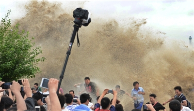 | 钱塘江潮涌时的壮观景象。 黄曙林 摄 |