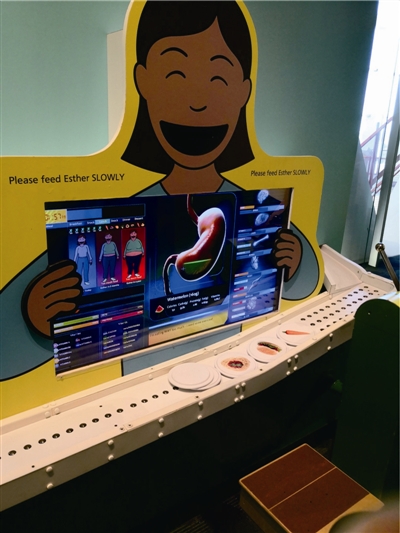 展品“埃丝特的饮食”简单而有趣(图3)。整体是一位女性“抱”着一个屏幕的造型,主要讲解人体饮食、消化、运动间的关系。观众把代表不同食物的卡片“喂”给埃丝特,扳动一侧的手柄来代表埃丝特的运动情况,然后可以通过屏幕看到所喂食物的营养成份、吃了该食物后埃丝特脂肪的变化、埃丝特运动的消耗以及人体所需的微量元素指标等。展品设计朴素,操作简单,互动性强,食物卡片回收平顺,说明文字幽默有趣。展品描述中有一条免责声明:请只喂埃丝特豆类和西兰花等,希望她不要真的“放屁”哟!