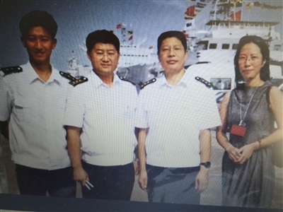 | 2002年5月15日,青岛某军港码头为人民海军首次环球航行送行时,本文作者(右一)与“青岛“号导弹驱逐舰首任政委郭守仁(右二)合影。 |