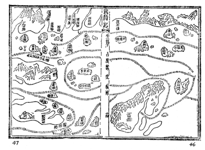 | 图2:《郑和航海图》(局部)。此图采用“一”字写景法绘制,编入《武备志》时改为书本式,自右而左,录图40幅,国内18幅,国外22幅,最后附两幅“过洋牵星图”。此图绘制了中国东海和南海直至印度洋波斯湾的航路,是世界上最早的航线最长的远洋航海图。 |