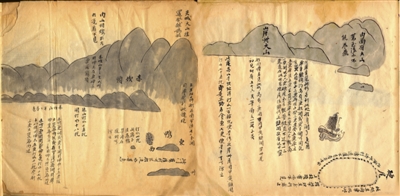 耶鲁大学藏明清《山形水势图》是1974年在美国学习的台湾学者李弘祺先生在耶鲁大学斯特林纪念图书馆“发现”的中国古代航海图册,近年来,关于它的深入研究才达到高潮。这套航海图册由122幅“山形水势图”组成,图中共有地名约295个,大部分为中国沿海州县、岛屿、礁石和山丘地名,少部分为日本、朝鲜、越南、柬埔寨和泰国的地名。这套航海图除了中国沿海海域外,北面扩展到朝鲜半岛,经朝鲜海峡中的对马岛到日本列岛;南面延伸到西沙、南沙群岛,绕过越南南部海域,最南到达今曼谷湾。