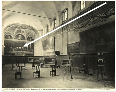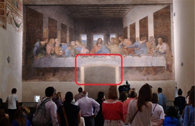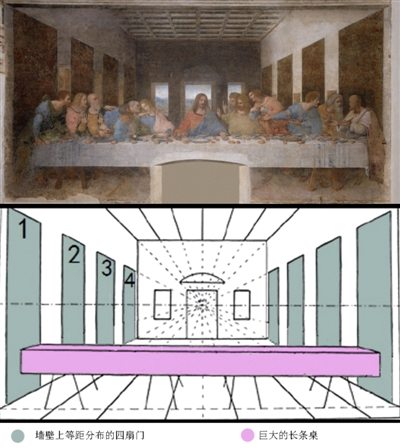 | 图4:最后的晚餐最佳的观赏角度,可以看到真实建筑的墙壁好像延伸到了画中,画中的空间变得好像真的一样。 |