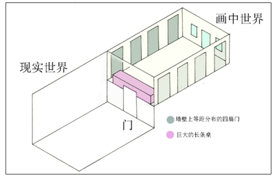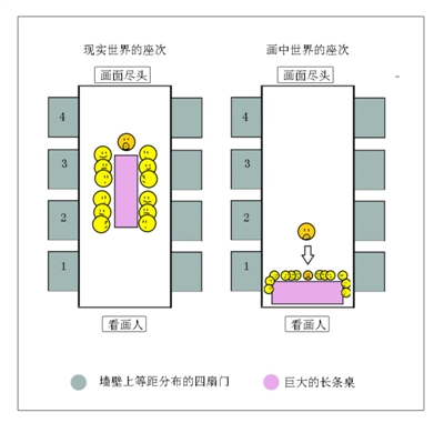仔细推敲,聚会用这样的座次多奇怪!现实生活中,长条桌一般顺着房间的走向在中部摆放,主人领座,其他宾客并列于两长边。通过墙上的门洞,可以知道长桌横放在画面近观众端,尺寸巨大,能坐下30人;桌边顶着“墙”(现实世界与画中世界的隔断),宾主脸冲墙挤挤挨挨坐着,每人仅限于跟自己相邻的人交谈,而房间其余3/4的空间却被闲置。
