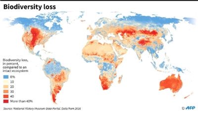 | 该地图显示:与完整的生态系统相比,不同地区的生物多样性损失情况。(法新社照片/西蒙·马尔法托) |
