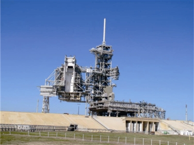 随着游览巴士的行驶,远远可以看到39号发射场(LC-39)两座高擎矗立的发射架,其中LC-39A发射架执行了6次“阿波罗”登月飞行的发射任务;而LC-39B则是航天飞机的发射平台。下车站在观察点可远观高高的发射架(图2),而低头,路面上被烈焰灼烧过的痕迹便会映入眼帘,它们仿佛正向游客诉说着火箭腾空升起时,那种排山倒海、地动山摇的震撼情景。