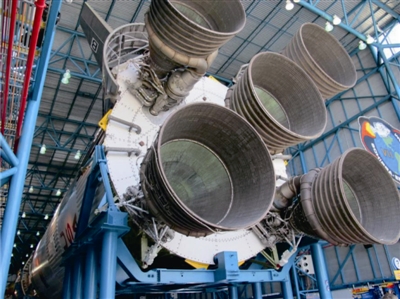 继续搭乘游览巴士前往阿波罗-土星5号中心,结束了只能远观的行程,给人们近距离观察和体验一些“真家伙”的机会。在这里可以通过实物和视频,了解土星5号火箭载运阿波罗11号飞船实现人类第一次登上月球伟大壮举的全过程。巨大的车间展厅高高支撑起长111米,直径为10米的三级运载火箭土星5号(图3),还陈列着空中指挥检测舱和登月舱等,这是上世纪60年代末和70年代初美国制造的15枚火箭之一。土星5号是世界上最大的运载火箭,观众看到由直径为两个人身高的发动机喷嘴、数以万计的管线设备、机械零件和电子仪器组装成的庞然大物,无不惊叹人类卓越的聪明才智与超凡的科技水平。