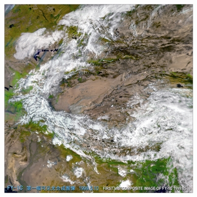 那是1999年5月10日,风云一号C星登上太空舞台后传下来了第一幅卫星云图,看过的人一致觉得它就像传说中的中国龙:飘忽不定的白云和喜马拉雅常年的积雪在绿色陆地、黄色沙漠、紫黑色水体的映衬下,龙头、龙眼、龙嘴、龙身、龙尾清晰可辨,栩栩如生,活脱脱一条盘踞在中国西部吞云吐雾的腾飞巨龙,真可谓“一遇风云画神龙”。