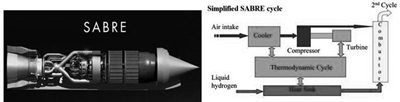 然而,从上述介绍不难发现,进气预冷发动机的关键是在高马赫数工作时在极短时间内将大量高温气流实现大幅度温降,同时具有质量轻、体积小的特点,以降低对发动机整体性能带来的影响,而传统的预冷技术无法达到这一极强换热能力及轻质、紧凑的要求。如美国射流预冷MIPCC方案、日本ATREX方案及俄罗斯ATRDC方案等,都因其中进气预冷部分换热能力低、预冷的收益远低于重量增加带来的不利影响、冷却剂大量消耗,以及其他技术难题而未能进入实际工程研制阶段。而近年来在进气预冷发动机领域最值得关注的是英国反应动力公司(简称REL)的“云霄塔”空天飞机的动力系统——“佩刀”协同式吸气火箭发动机(简称SABRE)相关技术进展。