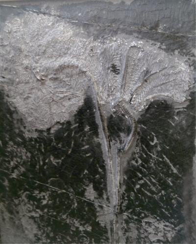 这是一件“海百合”化石。化石呈现出两个“海百合”,右侧这个大的,茎(管)长68厘米,花朵(腕、触手)直茎28厘米。左侧那个小点的,茎(管)长60厘米,花朵(腕、触手)直径26厘米。两个茎(管)表皮有明显的螺旋纹。仔细观赏,美丽动人。