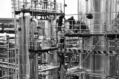 图为施工单位员工拆卸脚手架,为装置中交做准备。