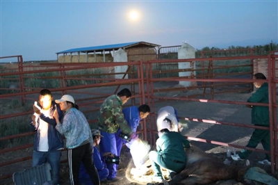 | 皎洁的月色下,兽医师正在给雄性野马准噶尔331号做治疗。张赫凡/摄 |