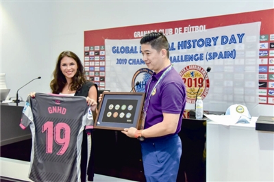 | 格拉纳达足球俱乐部(西班牙甲级联赛球队)公关关系总监,向本文作者陈天(右)赠送印有环球自然日英文缩写字样(GNHD)的客场球衣(格拉纳达球队就是穿这款球衣客场作战,提前一轮返回西甲序列,所以有特殊的含义)。陈天回赠环球自然日8周年纪念徽章。西班牙作为世界体育强国,不仅仅是因为运动员的身体素质强,而且跟其系统而科学的体育科学学科的完备也大有关联。 |