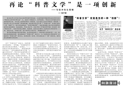 至于它应该叫什么,是“科学文艺”、“科普文学”、“科学小说”,还是“科研小说”,是仍归属科普作协管理,还是另外搞一个科学小说协会,这都不重要。重要的是我们应该有一批文艺作品,来表现这个全球最大科研群体的生活风貌。