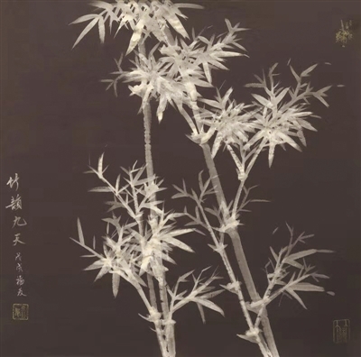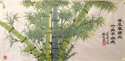 他的作品题材多为写竹,笔笔见功夫,风格清新自然,有自己独特的绘画语言,做到了虚实、繁简、疏密的统一;在行笔精微严谨处,气静笔健,清隽生动。