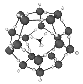 水分子一般通过氢键合成多面体笼。自然界中存在的天然气水合物中天然气主要成分为甲烷,所以又常称甲烷水合物,通常赋存在深海沉积物和陆域永久冻土带中。