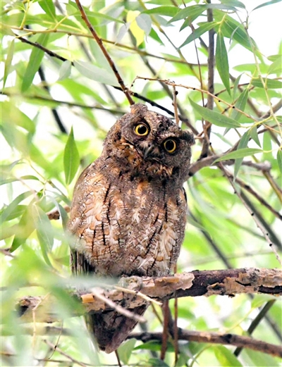 特别是小红角鸮,一身毛茸茸的,灰青色,跟大的成年的红角鸮很不一样。但是小红角鸮很萌,一会儿正脸看拍摄的人,一会儿歪头看着我们。