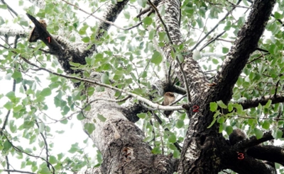 6月26日那天下午,我有时间出来,忽然有一种抑制不住的冲动,要去看看红角鸮萌萌的样子。我到圆明园后,找到红角鸮所在的地点,已经有三四个鸟友在拍摄了——树上的红角鸮有三只,两只成年红角鸮,一只红角鸮雏鸟。由于红角鸮站立的很高,在粗大的树上,枝丛缭绕,所以很难拍摄到清晰的红角鸮。但是,不管怎样,第一次亲眼看到了猫头鹰,而且第一次用自己的相机记录下猫头鹰的形态,还是非常兴奋。