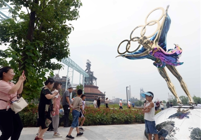 | 首钢园内,奥运元素随处可见,参观的人们在此拍照留影。摄影/崔 峻 |