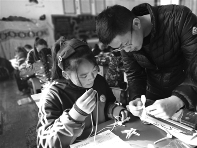 | 专家团队老师王寿刚指导孩子们组装橡皮筋飞机。 |