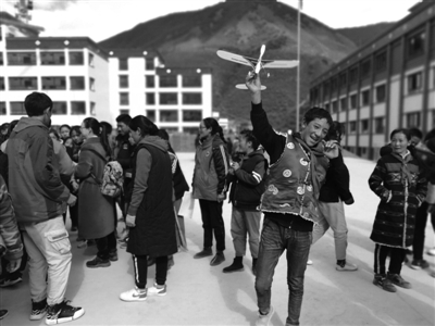 | 白玉县二完小B区的学生在试飞橡皮筋飞机。 |