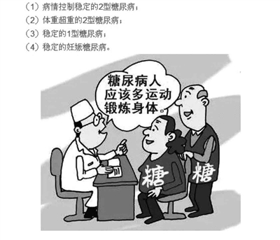 某些糖尿病患者或在某些特殊阶段并不适合参加体育锻炼,比如有明显低血糖或高血糖症,或者血糖波动大的患者,暂时不宜运动,应待血糖稳定后再运动。
