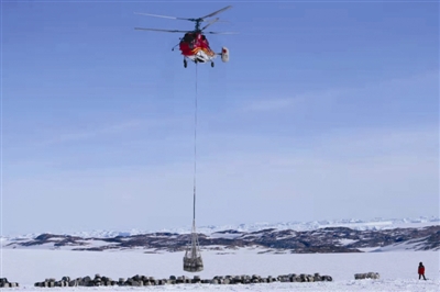 图2为直升机将货物从“雪龙”号上调运至内陆出发基地(11月23日摄)。