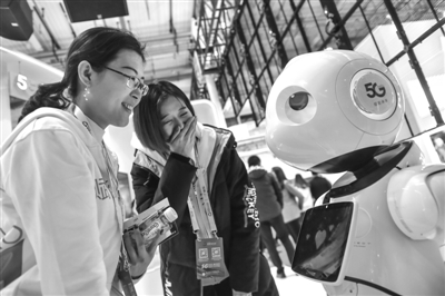 图为会上被观众围观的一款5G机器人。 新华社发(彭子洋 摄)